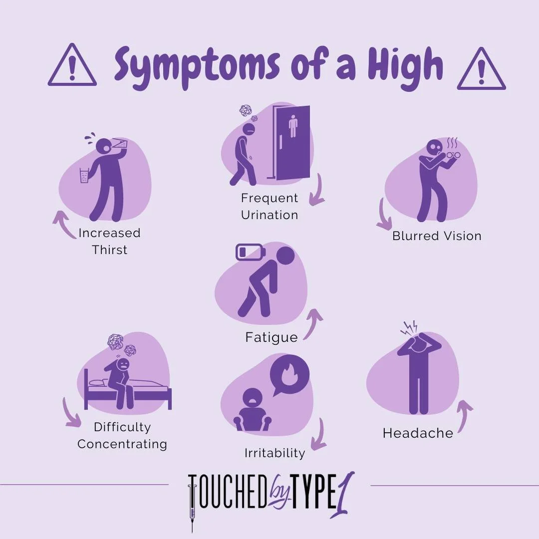 It's important to know what the symptoms of having a "high" look like, so you know when and how to properly treat it. These are just some of the common symptoms that people experience when their sugar is high. Are there any different or unique symptoms that you experience?