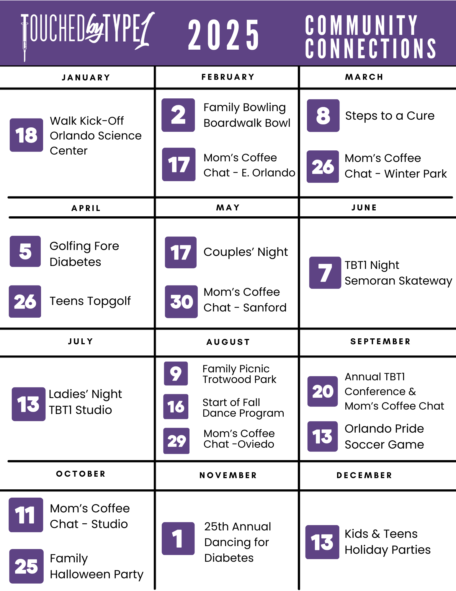 All of the programs by Touched by Type 1 work together to provide a positive experience for those who are touched by type 1, in Orlando and across the country. Your support helps us continue to make an impact in the type 1 community.